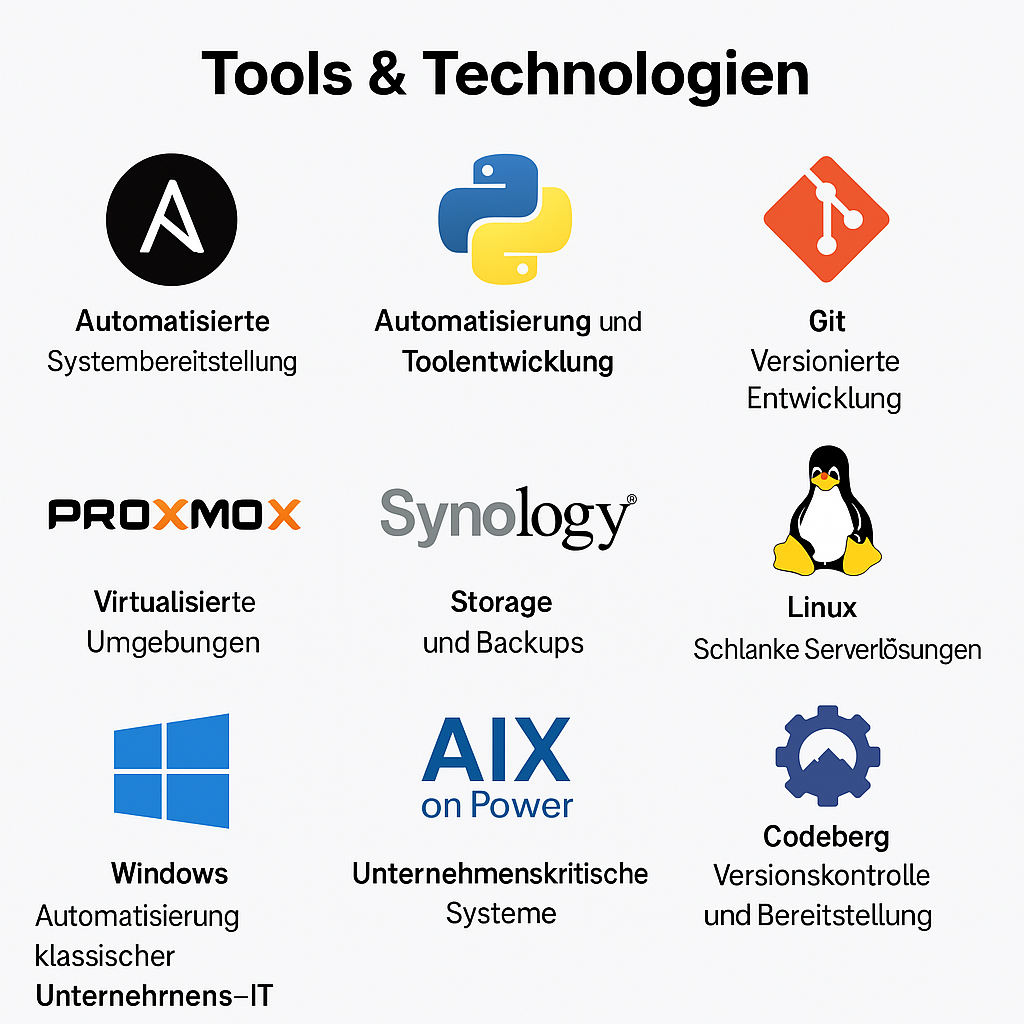 Unsere Lösungen basieren auf einer breiten Auswahl bewährter Open-Source- und Enterprise-Technologien, mit denen wir IT-Infrastrukturen zuverlässig automatisieren, betreiben und weiterentwickeln – skalierbar, zukunftssicher und gut dokumentierbar.